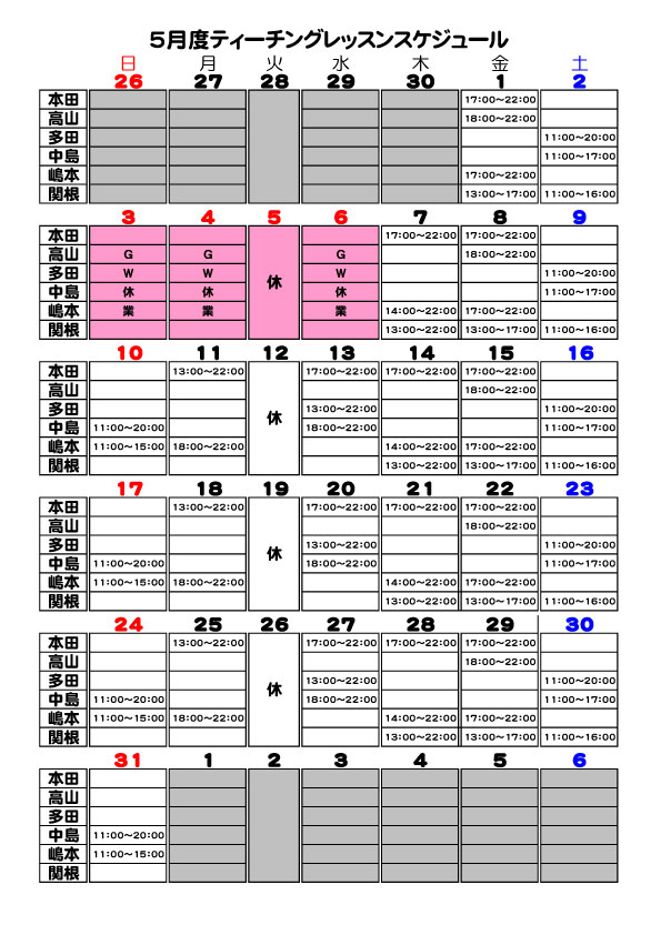 2026 / 04 / 032026年5月のティーチングレッスン 日程カテゴリーお知らせ , イベント情報 , スケジュールNo Image 2026年5月のティーチングレッスンの日程表です。 2026年5月ティーチングレッスンスケジュール(PDF) 2026 / 04 / 03カテゴリーお知らせ , イベント情報 , スケジュール